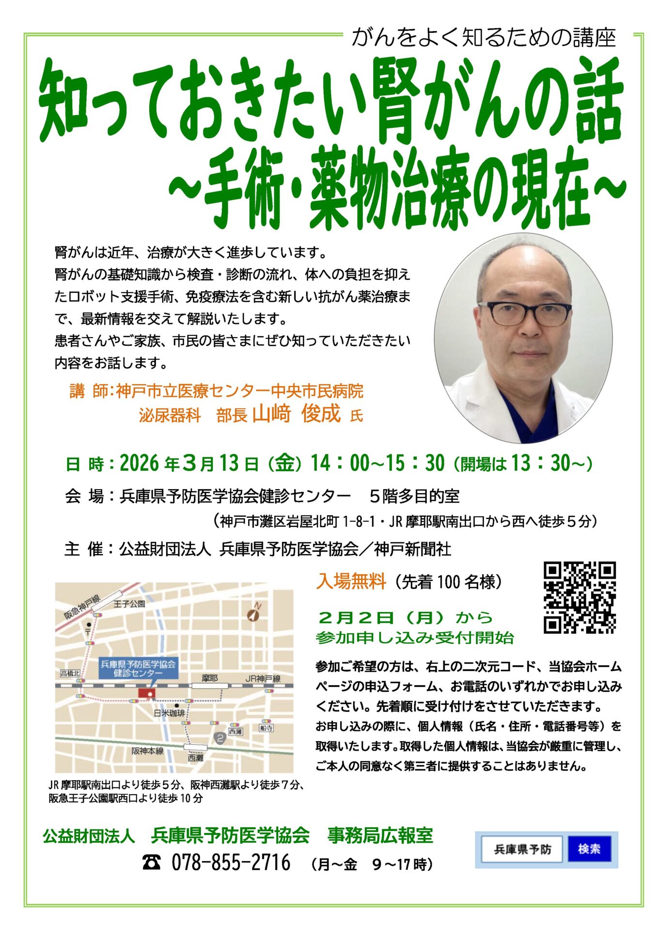 がんをよく知るための講座「知っておきたい腎がんの話 ~手術・薬物治療の現在~」参加者募集中です。